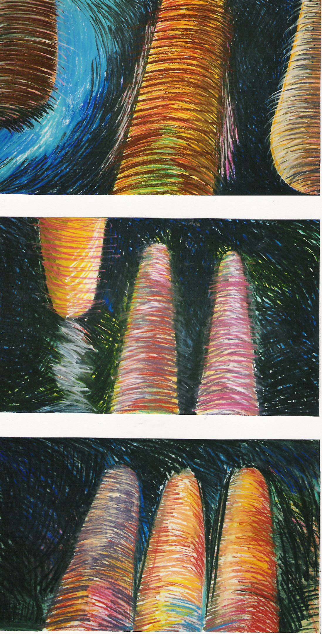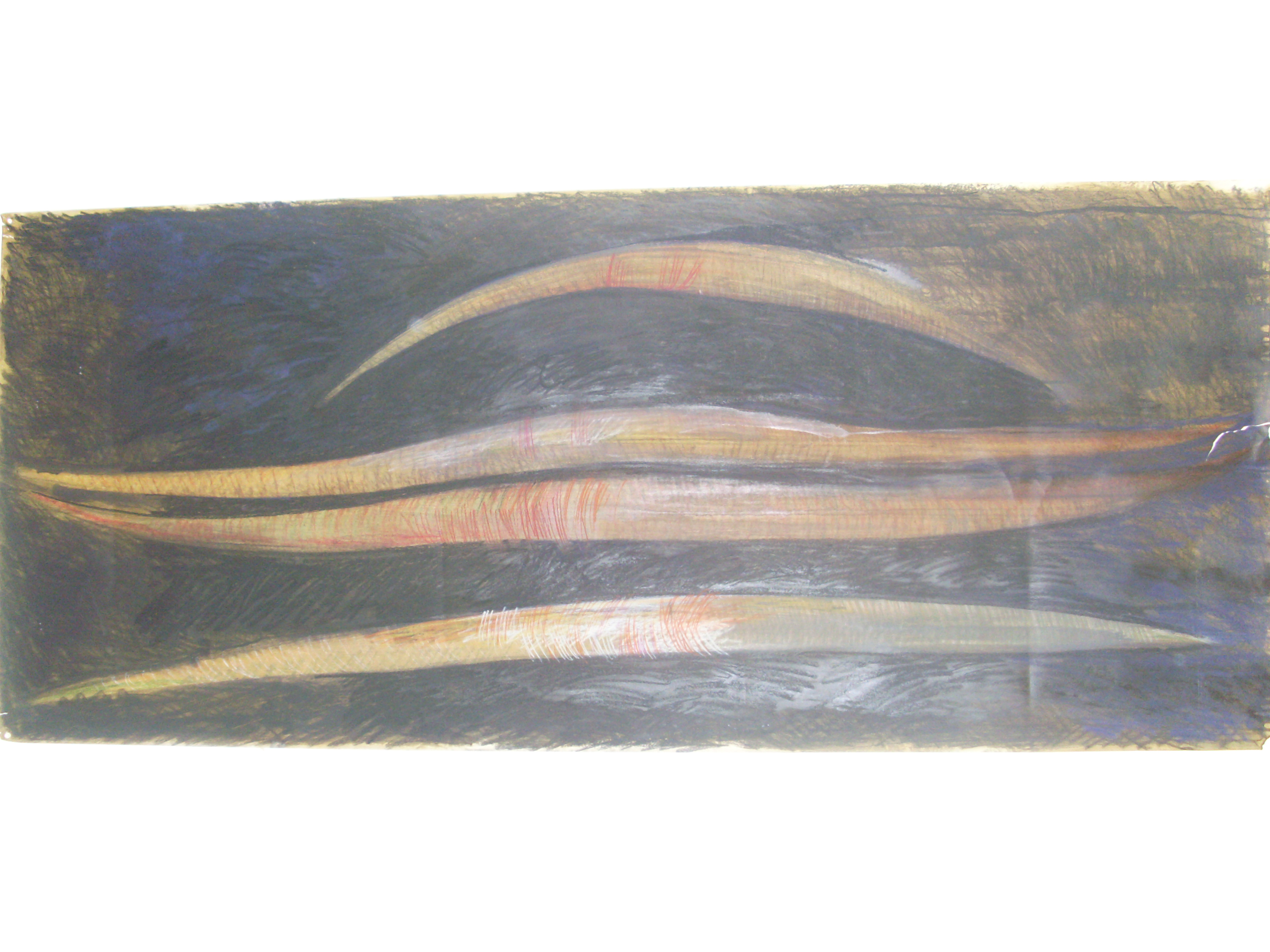 Denkoefeningen: Tekeningen met pastelkrijt. Eenvoudige ruimtelijke vormentaal in kleur.